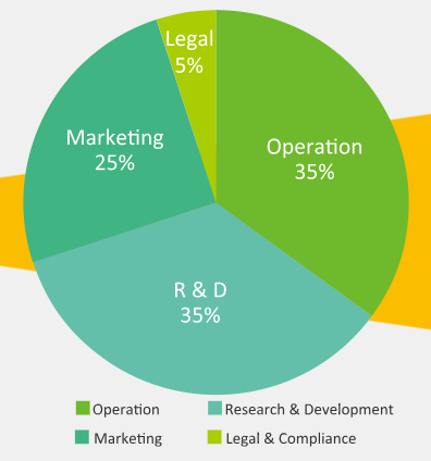 Operation: 35%Research & Development: 35%Marketing: 25%Legal & Compliance: 5%