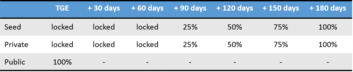 - Small supply of circulating tokens for the first three months (approx $2.5m USD), prior to seed, private sale and advisor unlocks at the three and six month marks