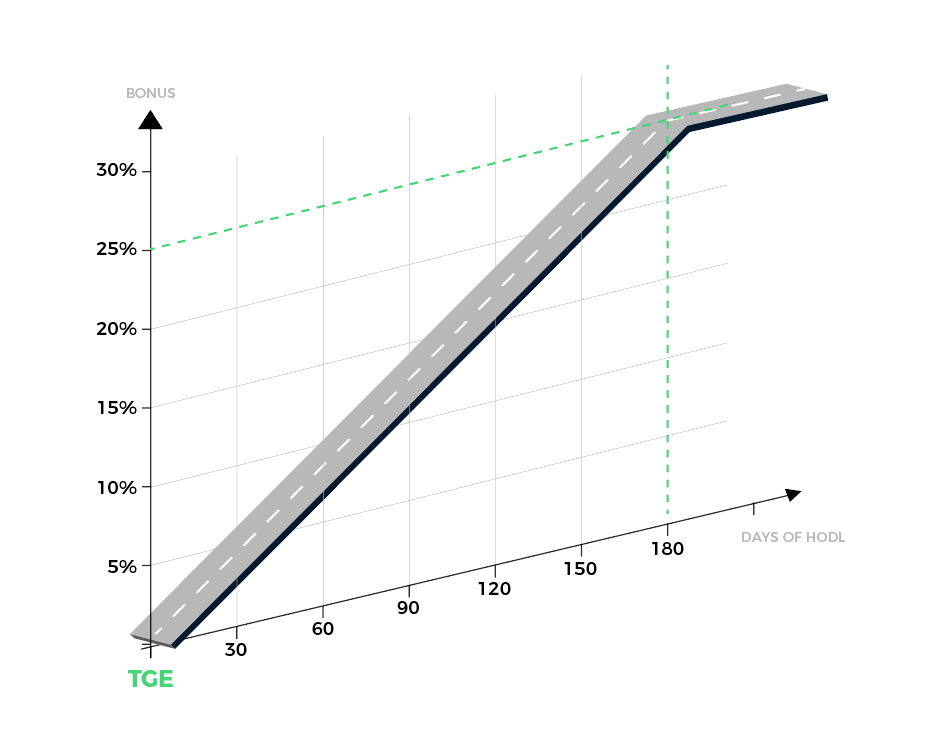 - HODL Highway program incentivises public sale contributors to hold tokens for up to six months for additional bonuses up to 30%