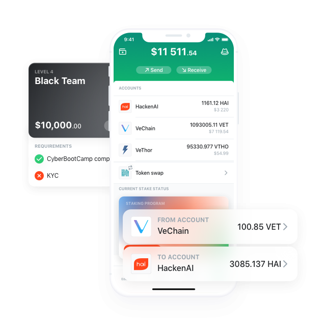 Easily send, receive and store your digital assets and cryptocurrencies on your device. The HackenAI Digital Wallet is secured with advanced encryption technology and supports many different blockchains, including VeChainThor and more. The main place to store and stake your HAI tokens, exclusive NFT collectibles.
